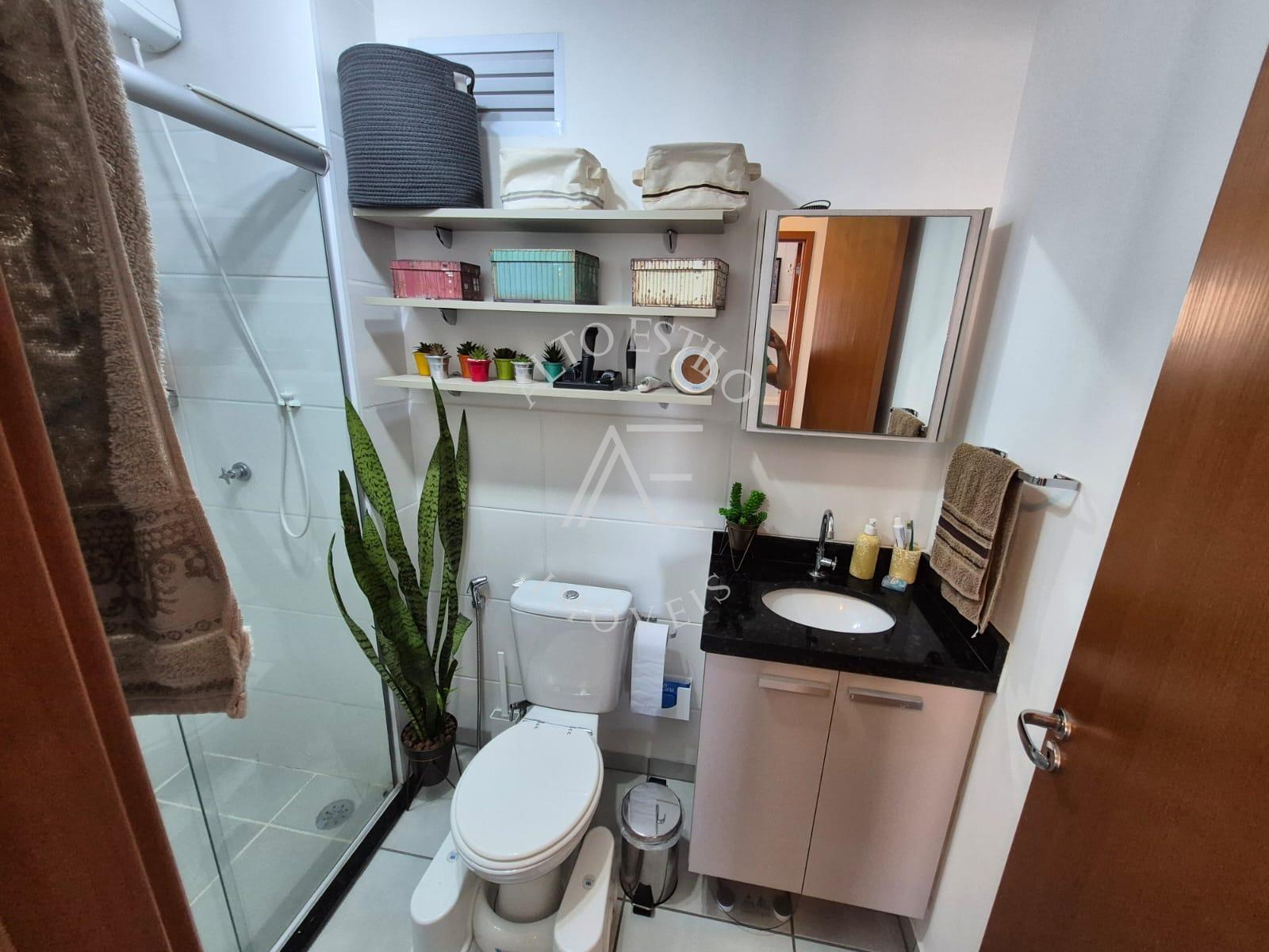 Banheiro completo, com armário planejado e box Blindex