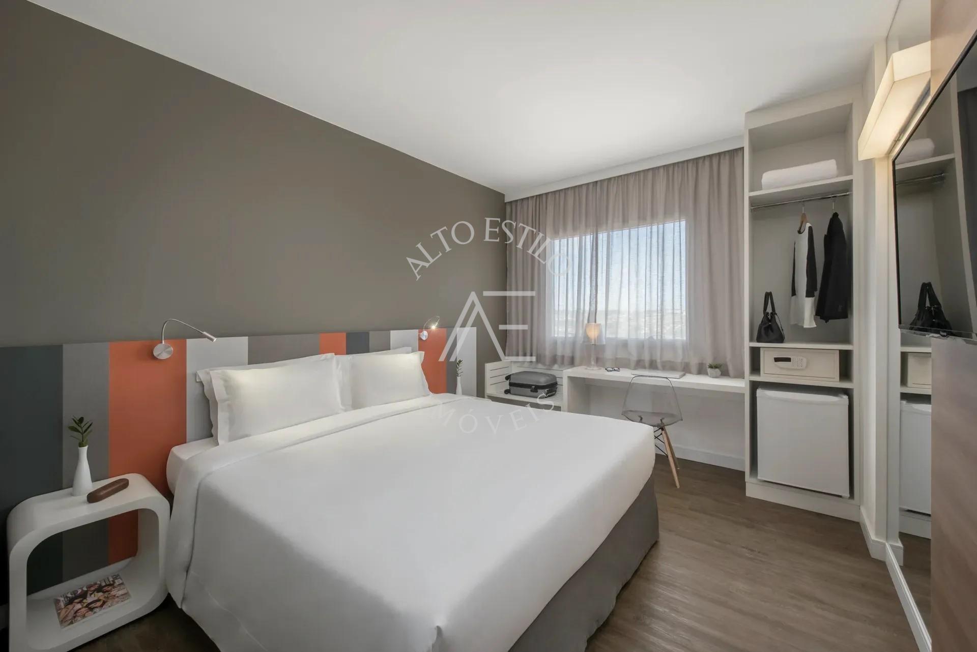 Suíte com 24m², totalmente mobiliada, pronta para geração de renda passiva através do sistema de pool hoteleiro, com praticidade e segurança.