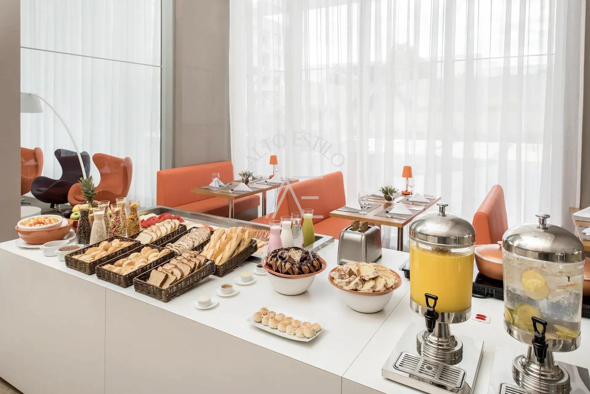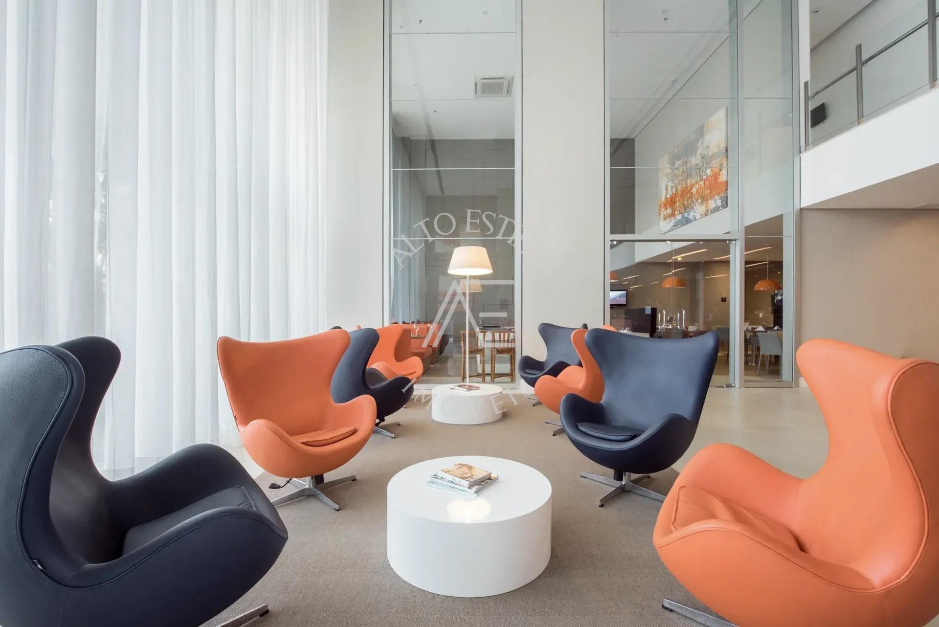 Estrutura completa com recepção, restaurante, academia, estacionamento e serviços de hotel.